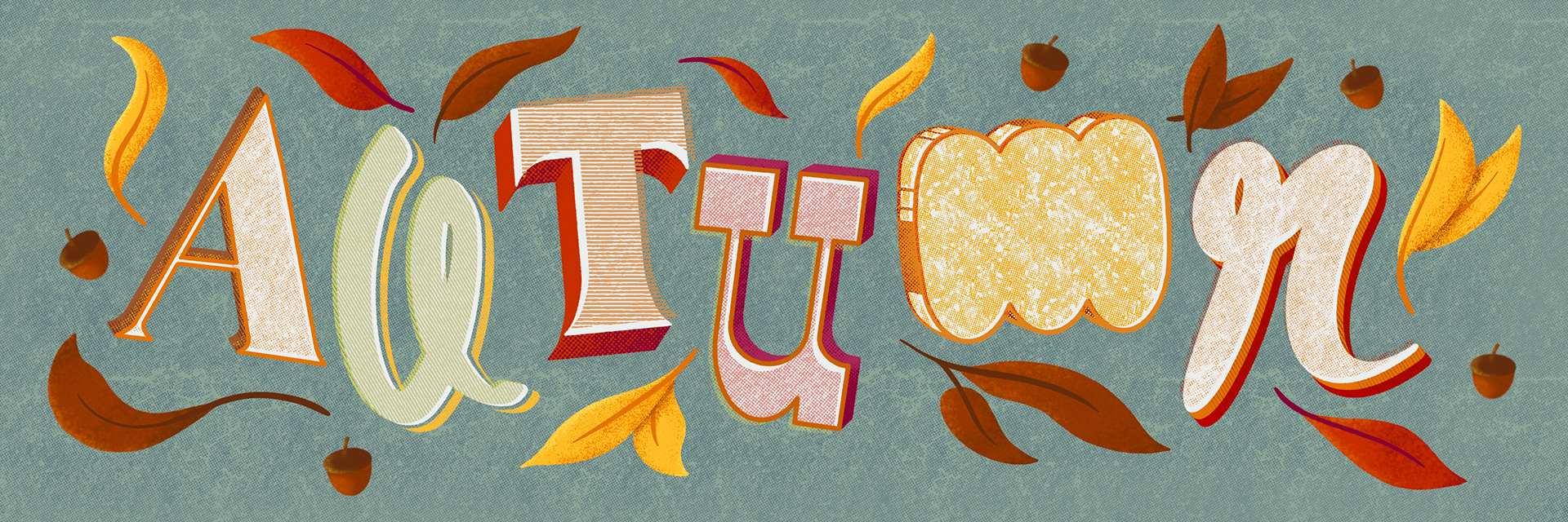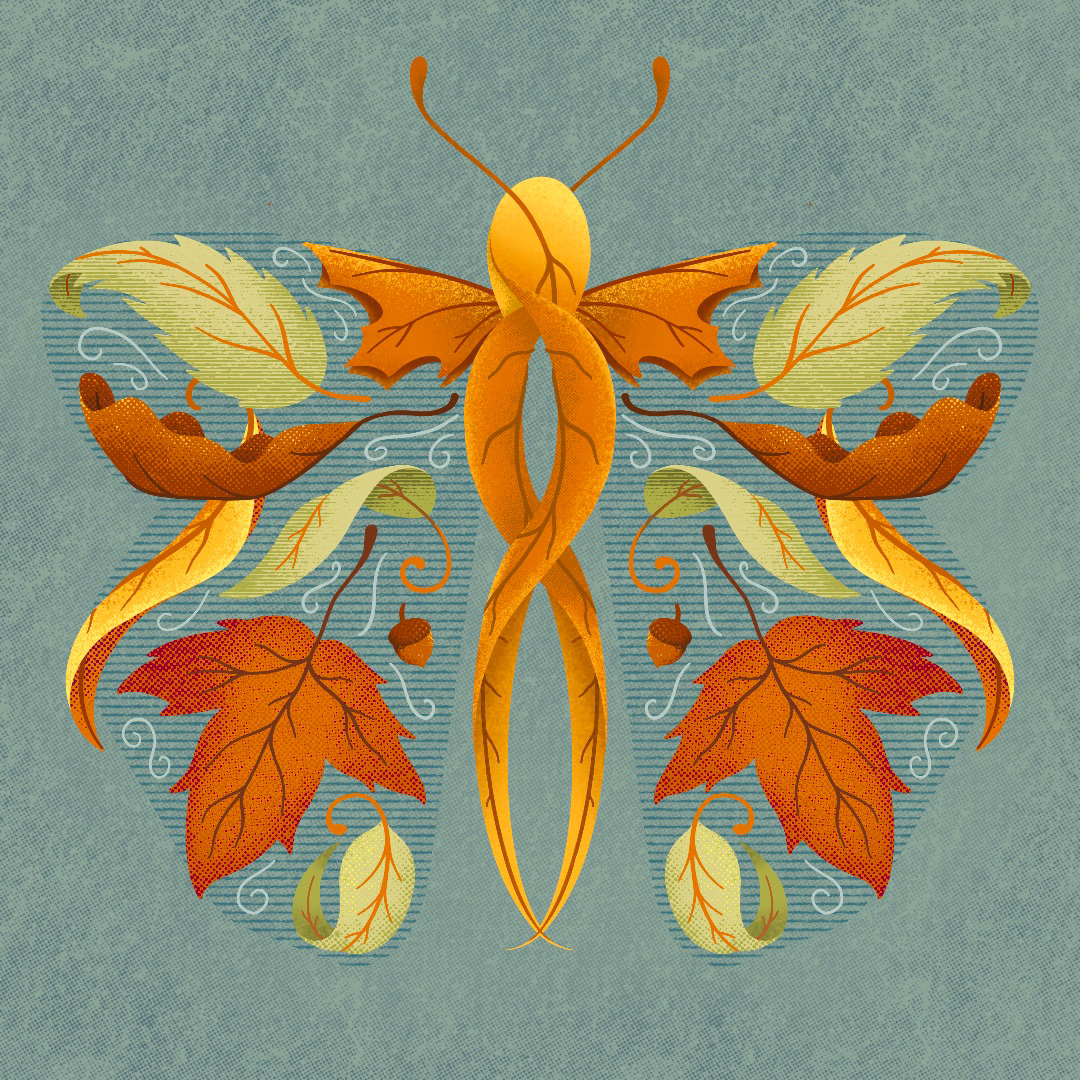 Autumn lettering and leafy butterfly illustration.