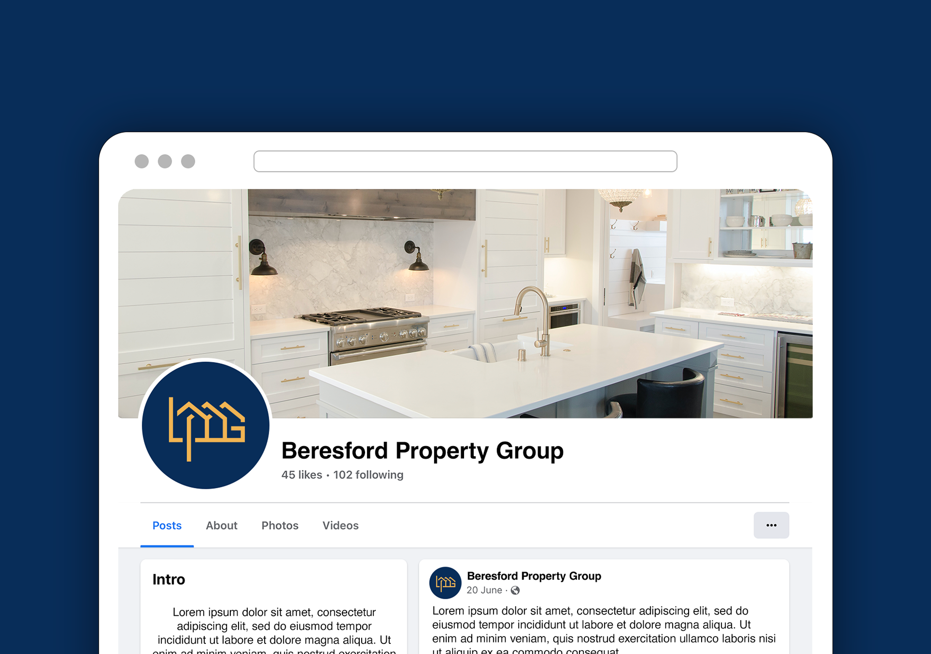 Branding for property investment firm Beresford Property Group, featuring logos, brand guidelines, social designs and more. The requirement of the project brief was to create a high-end and modern aesthetic, with the selected colours, clean forms and sans serif typefaces combining to achieve a suitable look and feel, in line with the client's needs.